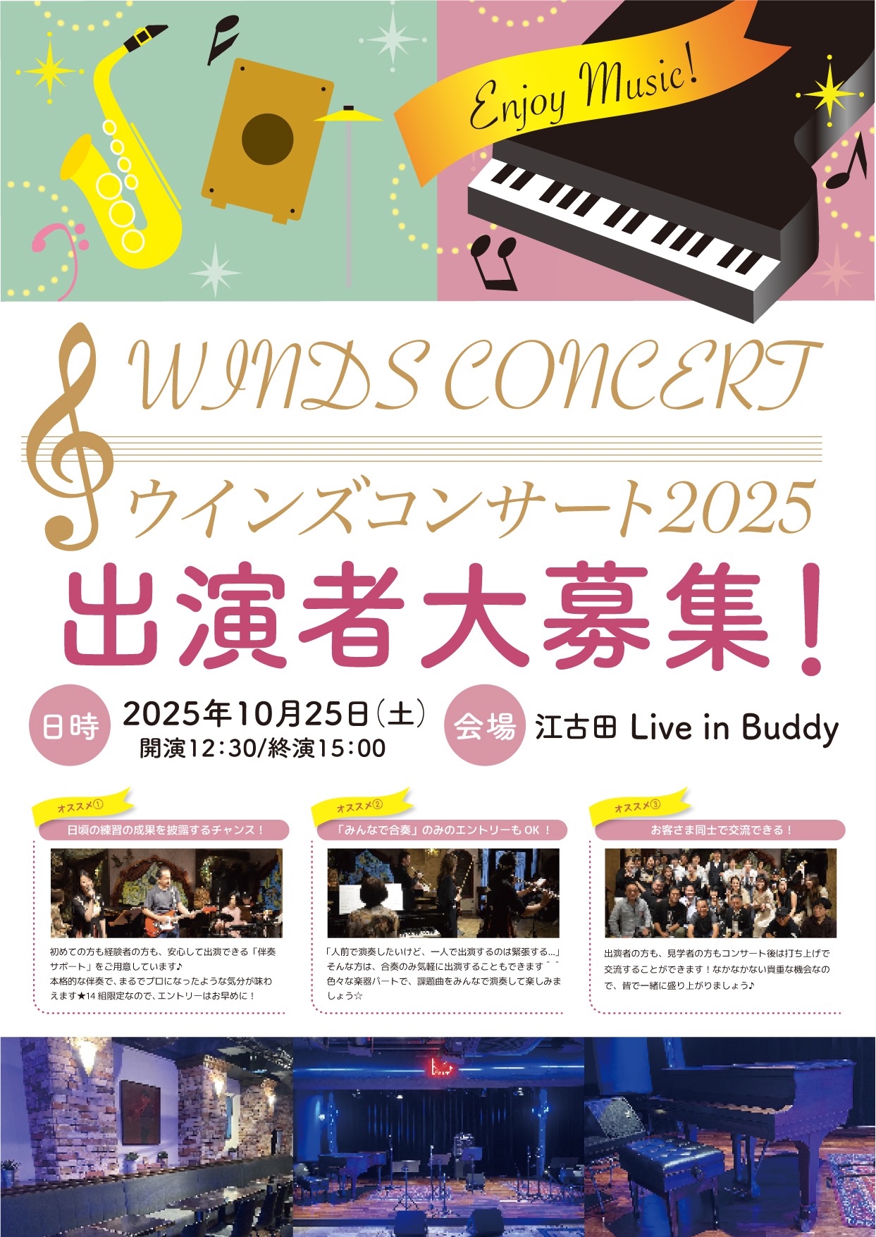 2025年のウインズコンサートは、場所も新たに江古田駅近くのスタインウェイのあるライブハウス、Live in Buddyにて開催となりました♪こちらの会場は、オープンから35年以上経つ音楽好きの方にうってつけのライブハウスとなっており、広いステージに、着席130席のゆったりとした客席が魅力の一つとなっております。そして何より、今回は生ドラムでの演奏披露も出来るという事で、ライブハウスならではの会場の雰囲気も味わっていただけたのではないかと思います!ご出演頂いた皆さまも、いつも以上に輝いておりました(*^^*)